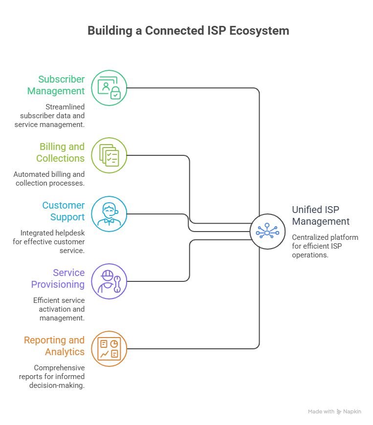 Run your broadband business on one powerful platform for subscriber management, billing, CRM, network operations, complaints, collections, and service delivery Complete ISP Management.